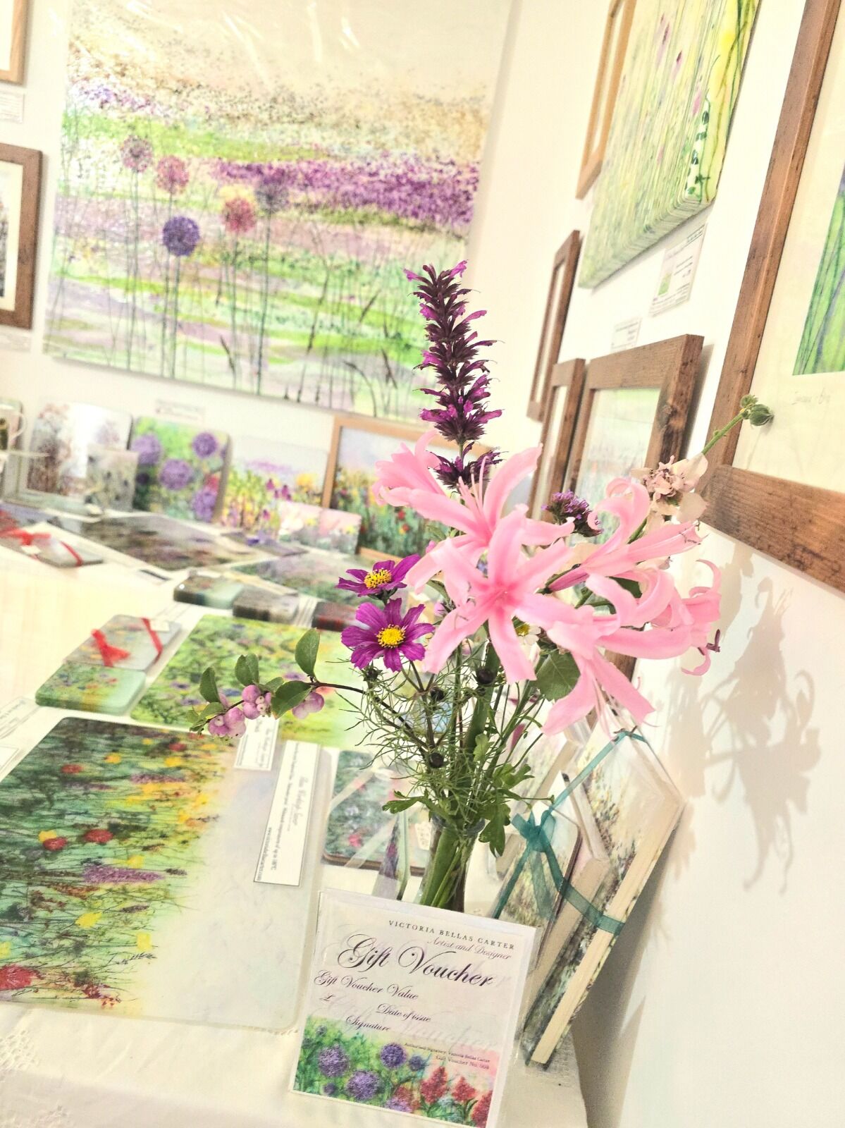 Original tissue paper collage artwork and prints are on display and for sale in the studio. Useful items and special gifts inspired by the original tissue paper collages, include fine china mugs, hardback notebooks, tablemats, glass work-top savers, glass coasters, melamine coasters, cheeseboards, chopping boards, glass framed prints, journals, greeting cards, ribbon tied gift packs and more.